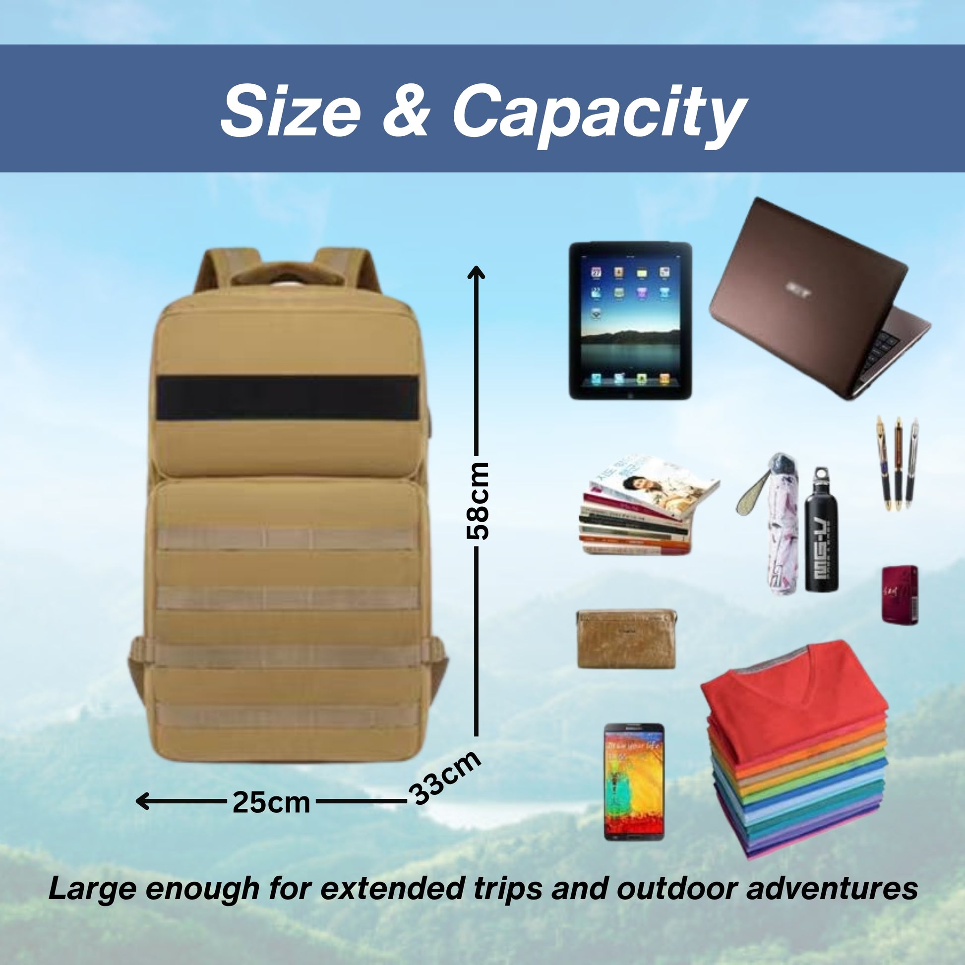 - Multi-Purpose Trekking Bag – Ideal for trekking, hiking, camping, travel, gym, and outdoor adventures, this spacious travel backpack is designed for both men and women.Large Capacity Travel Backpack – With a 50-litre storage capacity, this rucksack duffle bag offers ample space for clothes, gear, and essentials for long trips and outdoor activities.Durable & Water-Resistant Rucksack – Made from high-quality, water-resistant material, this hiking backpack ensures durability and protection in all weather conditions.Ergonomic & Comfortable Design – This trekking backpack features padded shoulder straps, an adjustable chest strap, and a breathable back panel for maximum comfort during long journeys.Multipurpose Utility Bag – This hiking rucksack comes with multiple compartments, side pockets, and a shoe compartment, making it a perfect travel bag for adventure lovers.